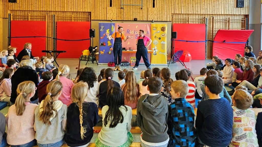 Und in diesem Jahr, im März führten die beiden Schauspieler Edward und Lukas die Show in unserer Turnhalle auf. Die Kosten trugen der Freundeskreis der Schlierbach Grundschule und die Eltern. Die Kinder der Klassen 1- 4 haben zuvor im Rahmen des Unterrichts einige relevante Wörter vermittelt bekommen z.B. „spoon“ oder „rocket“, aber auch „stinky cheese“. Durch dieses Vorwissen und vor allem durch die sehr ausdrucksstarke Darstellung der beiden Akteure, hatten die 102 Zuschauer großen Spaß und konnten dem Erzählstrang der Geschichte leicht folgen.